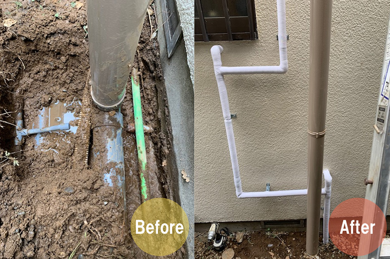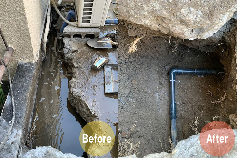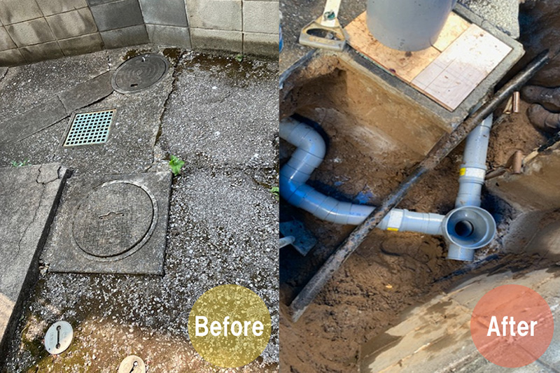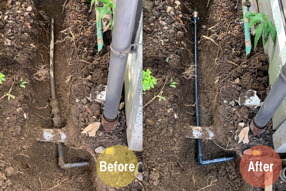旧配管を撤去して、新たに配管し直します。再生砂で埋め戻し、コンクリート打設して作業完了となります。