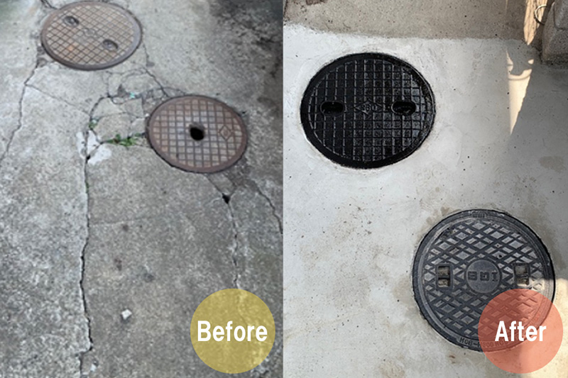 古いコンクリートを除去して、新たにコンクリートを打設します。鋳鉄蓋も新たなものに交換して作業完了となります。アスファルトでの修繕も可能です。