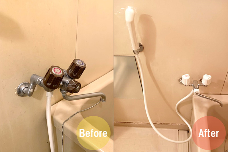 古いシャワー水栓を取り外して新しいシャワー水栓へ交換します。新たなシャワー水栓を取り付けます。お客様のご要望が特に無ければ、現状と似たようなシャワー水栓を取り付けさせていただきます。