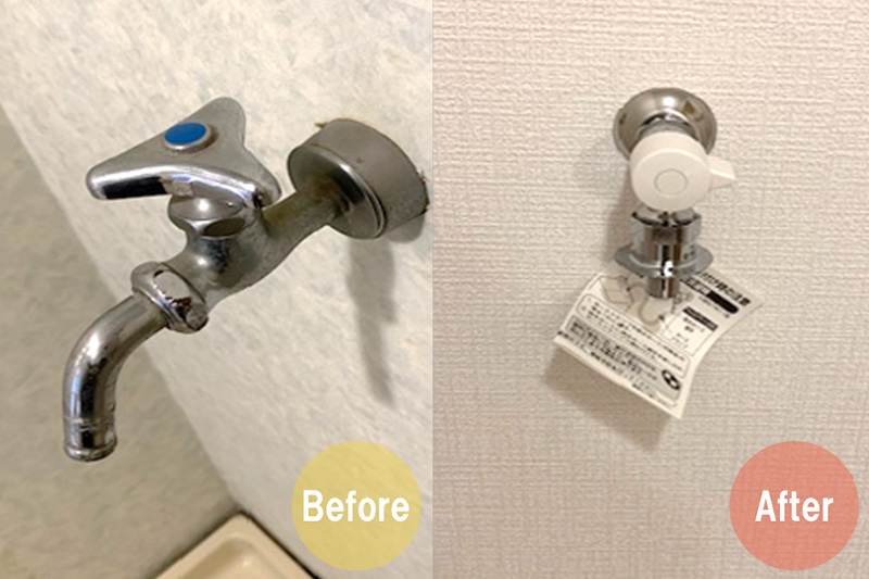 古い洗濯機水栓を取り外して新しい洗濯機水栓へ交換します。新たな洗濯機水栓を取り付けます。
