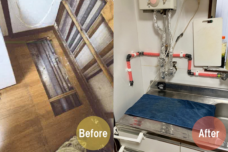 天井裏の銅管エルボ付近でピンホールの穴が開いて漏水しています。エルボ付近を新たに配管し直します。架橋ポリエチレン管にて配管し直した後、グラスウールにて保温巻きをして作業完了となります。