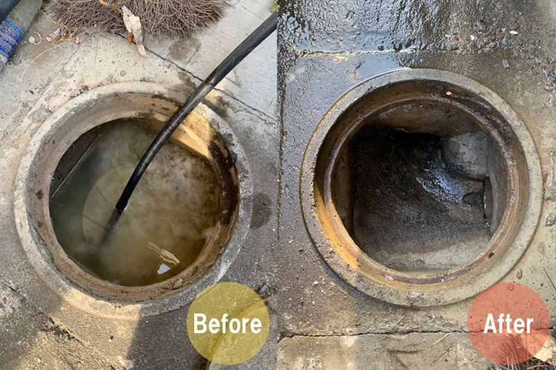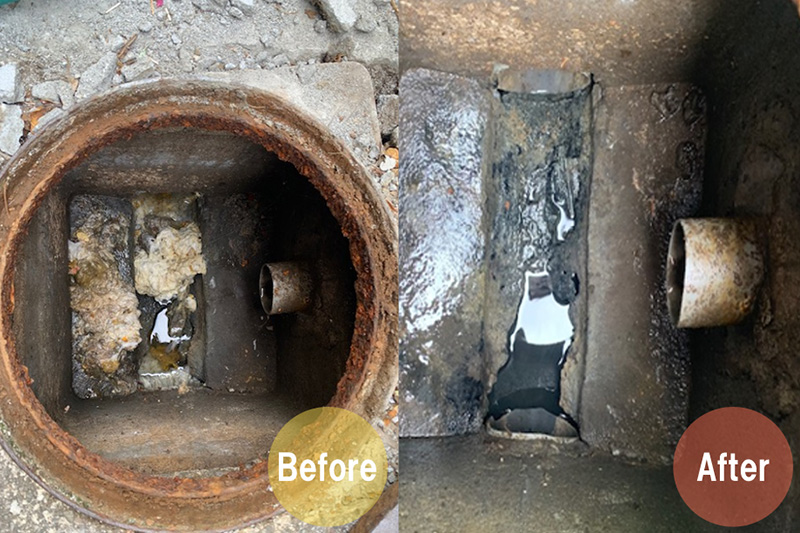 コンクリート桝に溜まった汚物を除去していきます。コンクリート桝に溜まった汚物を全て除去し、最後に水を流して詰まりが無いか確認をして作業完了となります。